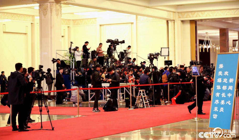 2018年“部長通道”,中外記者提前就位“排兵布陣”。(圖片來源:央視網(wǎng))