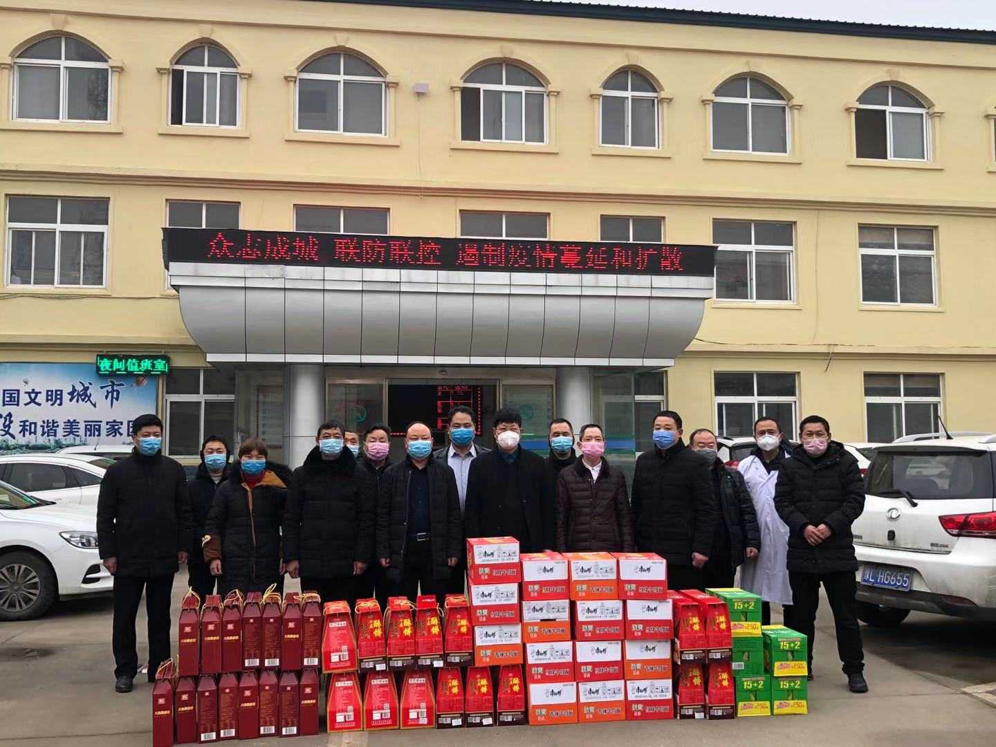 2月7日鄭玉海(前右4)帶領(lǐng)鎮(zhèn)鄉(xiāng)村醫(yī)生自愿者到鎮(zhèn)衛(wèi)生院捐贈(zèng)物品慰問(wèn)一線人員