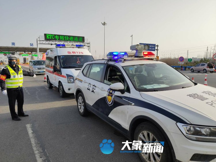 了解到這一緊急情況后,大象新聞記者緊急趕往鄭州南站,并聯(lián)系到河南省高速交警,提前做好準(zhǔn)備,把最左側(cè)車道讓出來,保障救護(hù)車順利下站,搶奪最佳救治時間。16點(diǎn)25分,救護(hù)車到達(dá)鄭州南站,早已做好準(zhǔn)備的高速交警,開通綠色通道,由警車開道直接下站,經(jīng)過快速體溫測量后,由省公安廳高速總隊一支隊劉珺、呂厚敬警官開著警車,一路護(hù)送奔向醫(yī)院。