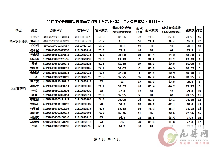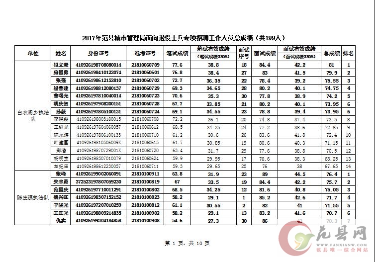 2017年范縣城市管理局面向退役士兵專項(xiàng)招聘工作人員總成績公示