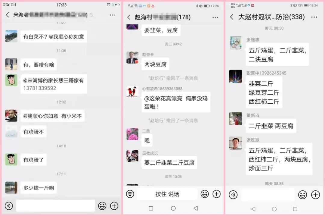 ? ? ? 目前,王樓鎮(zhèn)各行政村實行了專門人員代購采辦物資的策略,代購物資包括蔬菜,肉類,蛋類、牛奶、日護等生活必需品。為了防止人員登記配送時的接觸引起交叉感染,成立了便民微信群,所需物品只需在群內通報或者電話聯(lián)系相關人員即完成上報,由村干部及黨員代表組成的“快遞干部團”當天或第二日就會將直接送至每位村戶家門口。這種代購行動,大大減少了群眾外出集聚的機會,大大降低了疫情傳播的風險,更得到了村民們的支持和稱贊。