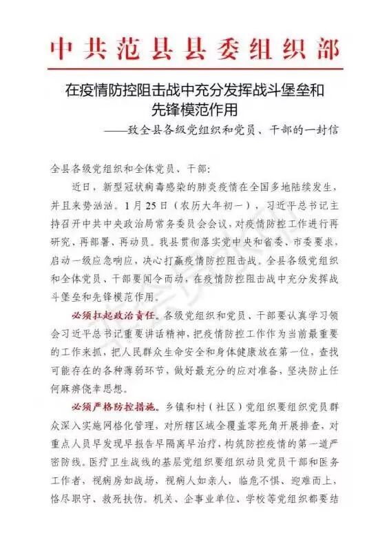 黨組織是堅強堡壘,黨員干部是先鋒旗幟。范縣向全社會發(fā)出動員令,號召黨員干部、人民群眾參與到疫情防控中來。各級黨員干部、醫(yī)務(wù)工作者、公安干警、基層老黨員、退伍軍人、大學(xué)生……紛紛響應(yīng),全縣上下形成了群防群控,奮戰(zhàn)有序的堅強堡壘,展現(xiàn)了一幕幕“舍小家、為大家”“召必回、戰(zhàn)必勝”的感人畫面。