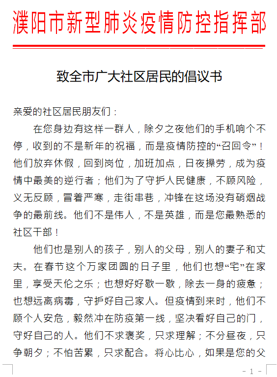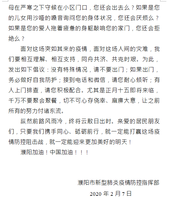 面對這場突如其來的疫情,面對這場人間的災(zāi)難,我們要相互理解、相互支持,同舟共濟(jì)、共克時(shí)艱。為此,發(fā)出如下倡議:沒有特殊情況,請不要出門;如果出門,務(wù)必做好自我防護(hù);接到電話和微信,請您耐心傾聽;有人上門排查,請您積極配合。尤其是正月十五即將來臨,千萬不要聚會聚餐,切不可心存僥幸、麻痹大意,讓之前所有的努力付諸東流。