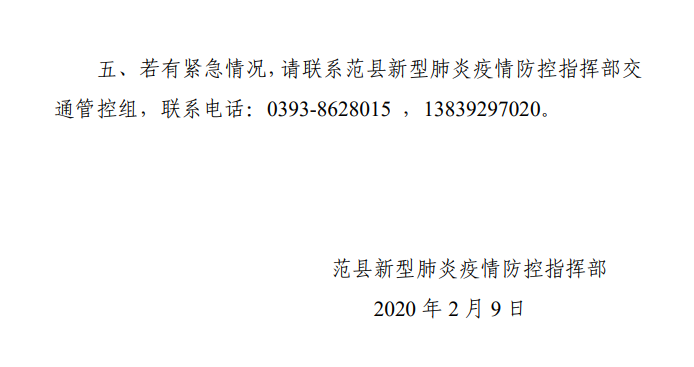 五、若有緊急情況,請(qǐng)聯(lián)系范縣新型肺炎疫情防控指揮部交通管控組,聯(lián)系電話:0393-8628015? ? ?13839297020。?