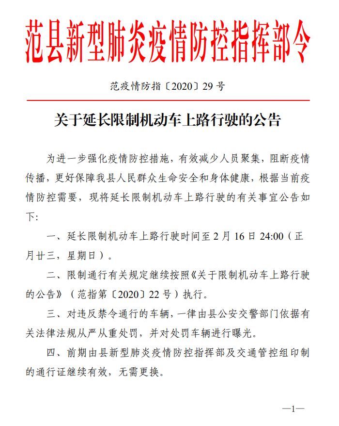 為進(jìn)一步強(qiáng)化疫情防控措施,有效減少人員聚集,阻斷疫情傳播,更好保障我縣人民群眾生命安全和身體健康,根據(jù)當(dāng)前疫情防控需要,現(xiàn)將延長限制機(jī)動(dòng)車上路行駛的有關(guān)事宜公告如下:?