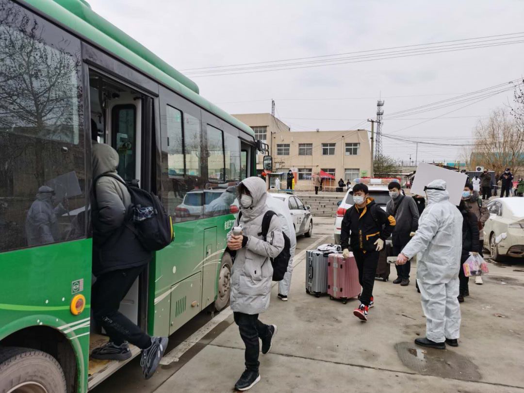 通過登記測溫的返鄉(xiāng)人員從臺前火車站駛到我縣高碼頭高速口臨時隔離區(qū)域。