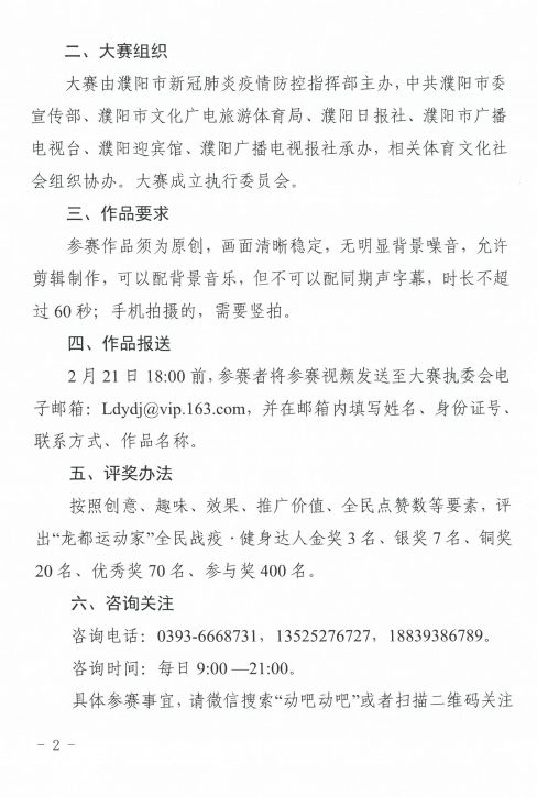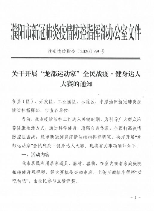市新冠肺炎疫情防控指揮部辦公室《關于開展“龍都運動家”全民戰(zhàn)疫·健身達人大賽的通知》(濮疫情防指辦【2020】69號)印發(fā)后,在廣大市民中引起強烈反響,大賽執(zhí)委會收到了大量郵件和電話咨詢。為更好地服務市民群眾參賽,確保大賽有序進行?,F(xiàn)將有關問題補充通知如下: