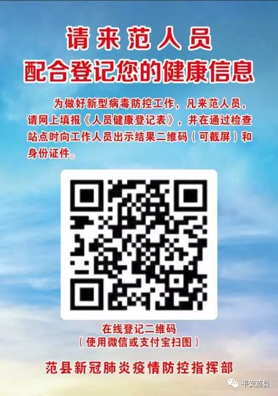 來(lái)自范縣新冠肺炎疫情防控指揮部的最新消息,凡是外地來(lái)范縣的車輛、行人,可以先行掃描(識(shí)別)“外地來(lái)范在線登記二維碼”,注冊(cè)成功后可以按照注冊(cè)步驟,填寫車輛人員信息,注冊(cè)成功后,到達(dá)檢查站時(shí),向工作人員出示注冊(cè)成功的二維碼后即可通行,便利快捷,省時(shí)省力。