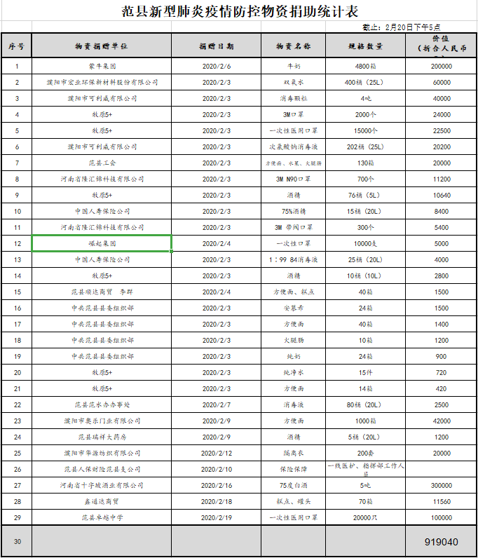 范縣新型肺炎疫情防控物資捐助捐款最新統(tǒng)計(jì)表