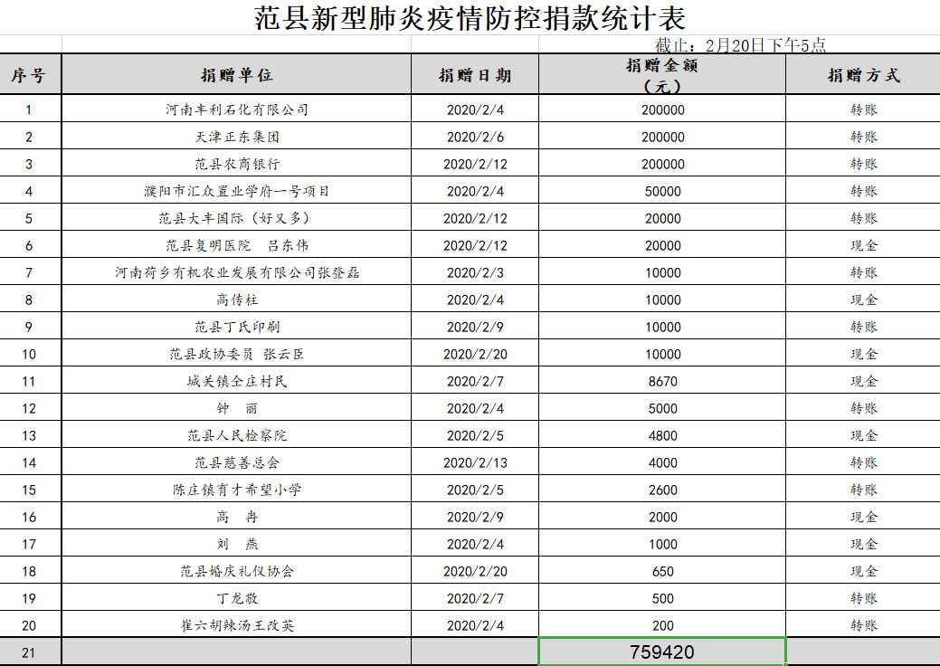 ? ? ? ? ? ? ? ? ? ? ? ?范縣新型肺炎疫情防控捐款統(tǒng)計(jì)表 ? ? ? ? ? ? ? ? ? ? ? ? ? ? ? ? ? ? ? ? ? ? ?? ? ? ? ? ? ? ? ? ? ? ? 截止:2月20日下午5點(diǎn) | ||||