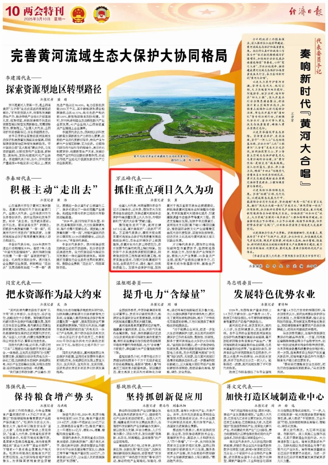 全國(guó)人大代表、河南省濮陽(yáng)市委書(shū)記萬(wàn)正峰表示,近年來(lái),濮陽(yáng)市大力發(fā)展綠色低碳經(jīng)濟(jì),在推動(dòng)黃河流域生態(tài)保護(hù)和高質(zhì)量發(fā)展上久久為功,為唱好新時(shí)代“黃河大合唱”貢獻(xiàn)力量。濮陽(yáng)地處黃河下游,黃河過(guò)境167.5公里,屬于典型的“二級(jí)懸河”河段。萬(wàn)正峰代表表示,濮陽(yáng)市堅(jiān)決落實(shí)黃河流域生態(tài)保護(hù)和高質(zhì)量發(fā)展戰(zhàn)略政治責(zé)任,在生態(tài)環(huán)境保護(hù)上鐵腕施策,在黃河長(zhǎng)治久安上持續(xù)加力,在水資源節(jié)約集約利用上精打細(xì)算。加快骨干水系通道和調(diào)配樞紐建設(shè),持續(xù)推進(jìn)防洪工程和涵閘改建工程,有序?qū)嵤┙鸬毯?、馬頰河防洪薄弱環(huán)節(jié)治理,全面提升引水、調(diào)水、輸水、防洪除澇能力。加強(qiáng)生態(tài)保護(hù)治理,加快黃河干流及重要支流生態(tài)廊道建設(shè),積極推進(jìn)黃河濕地生態(tài)環(huán)境整治與修復(fù),有序?qū)嵤S河大堤綠化提升、引黃灌溉調(diào)蓄生態(tài)涵養(yǎng)帶等重大工程。促進(jìn)文旅融合發(fā)展,加快中華龍?jiān)淳皡^(qū)、黃河治水文化園(瓠子堵口)等項(xiàng)目建設(shè),推動(dòng)國(guó)際雜技文化產(chǎn)業(yè)園等景區(qū)由觀光游向度假游、沉浸體驗(yàn)游轉(zhuǎn)型,促進(jìn)歷史文化名城與黃河流域文旅文創(chuàng)融合發(fā)展。萬(wàn)正峰代表表示,濮陽(yáng)市以綠色低碳轉(zhuǎn)型為重要抓手,堅(jiān)持制造強(qiáng)市、制造立市,加快推進(jìn)產(chǎn)業(yè)轉(zhuǎn)型升級(jí),聚焦六大產(chǎn)業(yè)集群、20條重點(diǎn)產(chǎn)業(yè)鏈,提高產(chǎn)業(yè)鏈供應(yīng)鏈競(jìng)爭(zhēng)力,已培育形成生物基新材料、氫能全產(chǎn)業(yè)鏈。