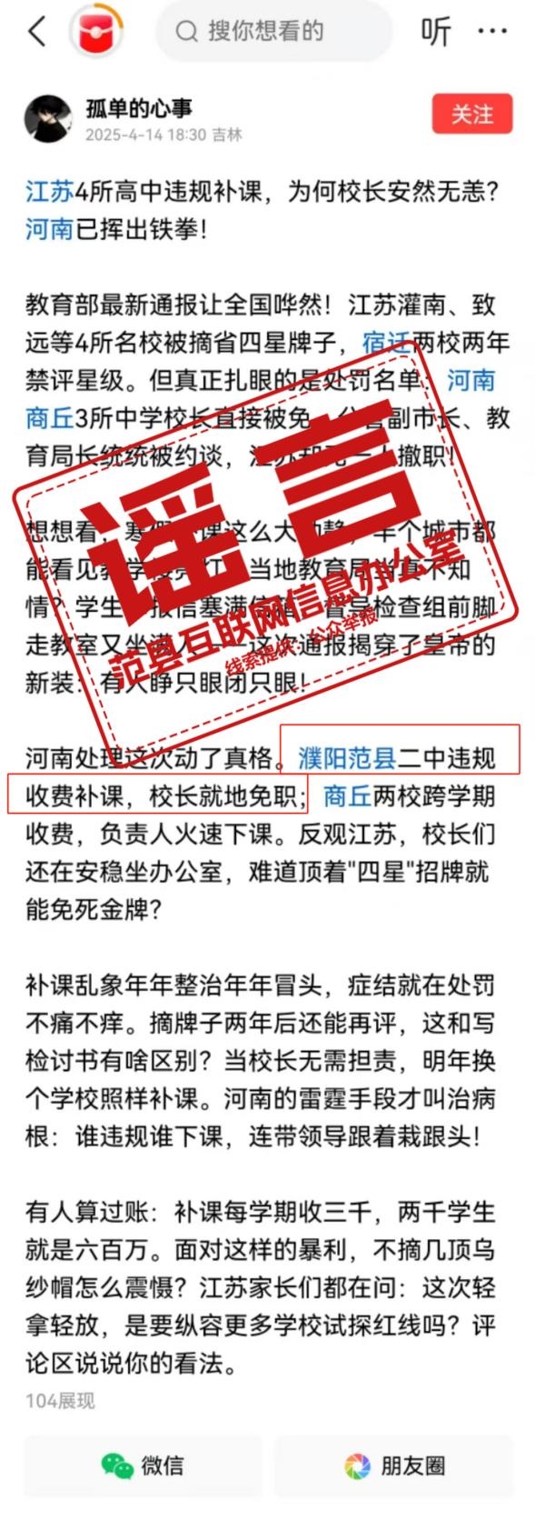 近日,有網(wǎng)民在今日頭條平臺(tái)發(fā)布“教育部最新通報(bào)讓全國(guó)嘩然!河南處理這次動(dòng)真格了。濮陽范縣二中違規(guī)收費(fèi)補(bǔ)課,校長(zhǎng)就地免職!”信息。經(jīng)范縣互聯(lián)網(wǎng)信息辦公室向縣教育局核實(shí),范縣沒有二中這所學(xué)校,只有第二初級(jí)中學(xué),范縣第二初級(jí)中學(xué)也不存在違規(guī)收費(fèi)補(bǔ)課現(xiàn)象,教育部近期通報(bào)的案例中也沒有范縣學(xué)校,網(wǎng)傳信息為謠言。