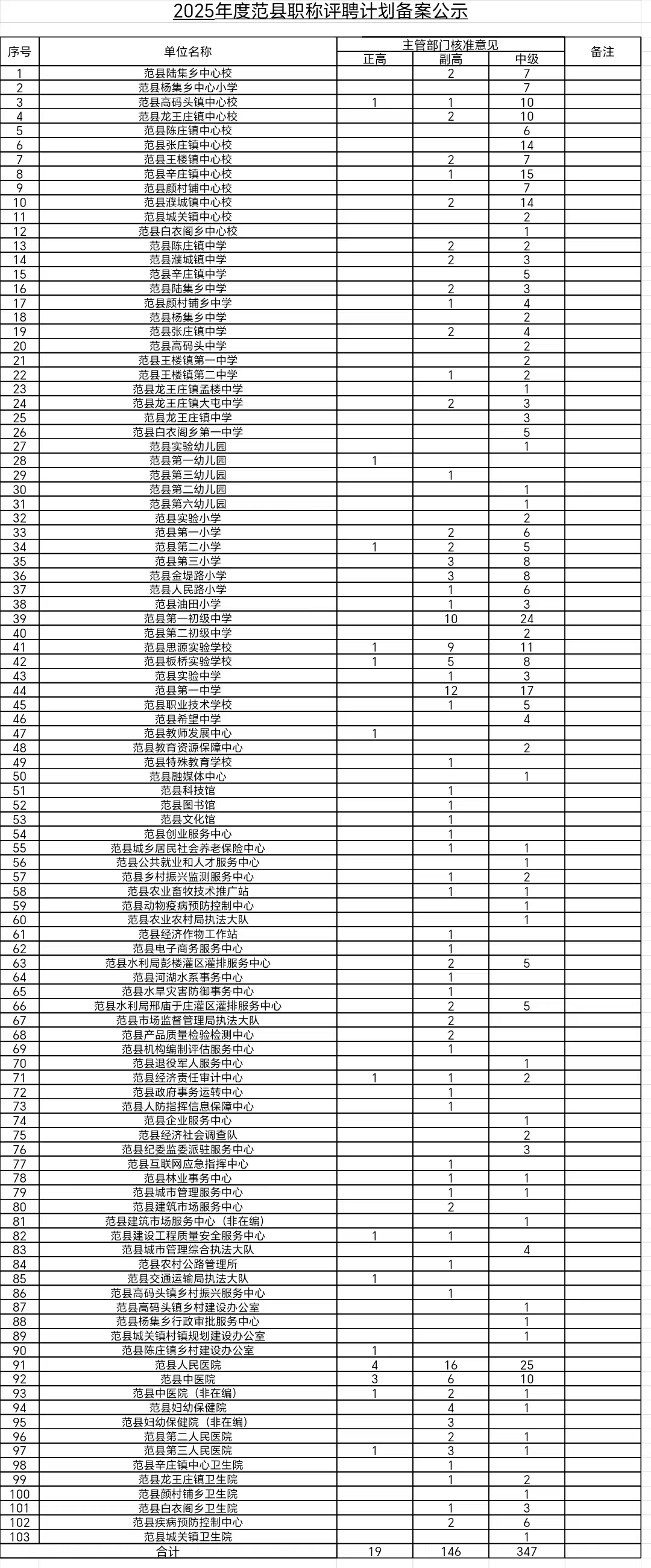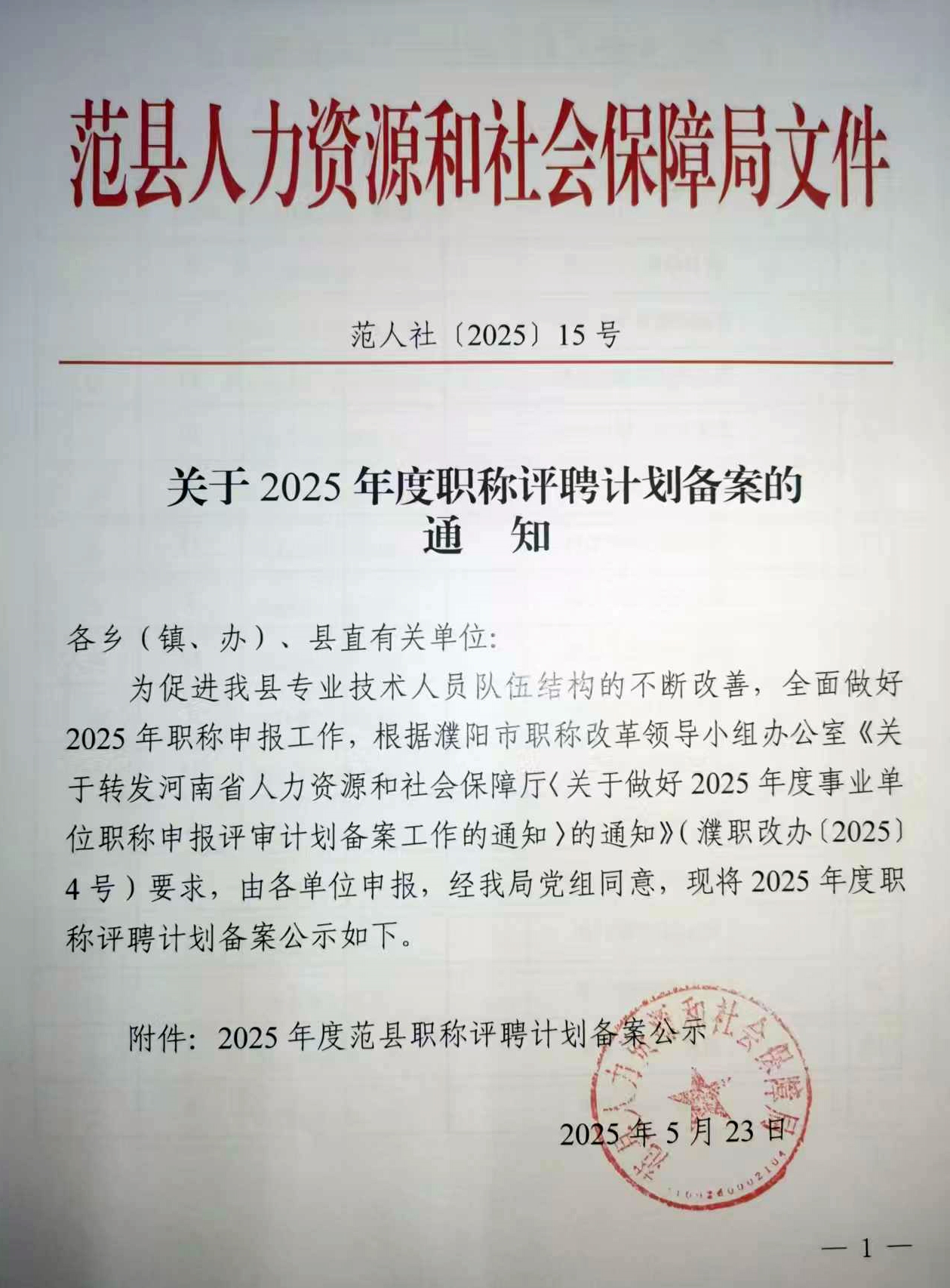 范縣人社局關(guān)于2025年度職稱評聘計劃備案的通知